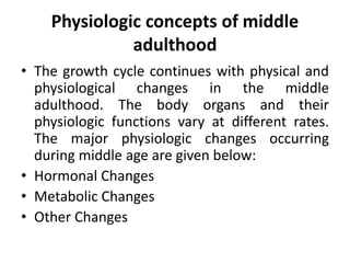 This document discusses the physiological changes during middle adulthood, focusing on hormonal and metabolic changes, particularly in relation to menopause in women and climacteric changes in men. It covers symptoms, management strategies for menopausal symptoms, various hormone replacement therapies, and their side effects. Additionally, it emphasizes the importance of maintaining a healthy lifestyle during this transitional period.
