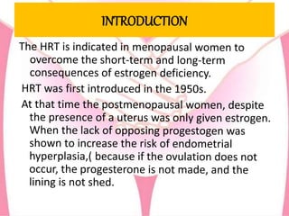 Hormone replacement therapy (HRT) is used in menopausal women to alleviate symptoms of estrogen deficiency and may be administered in various forms, including pills, creams, and patches. Types of HRT include estrogen-only, progestin-only, and combinations aiming to prevent osteoporosis and maintain quality of life, but it carries risks such as endometrial cancer and venous thromboembolism. Nurses play a crucial role in monitoring patients for these risks and assessing their medical history prior to starting HRT.