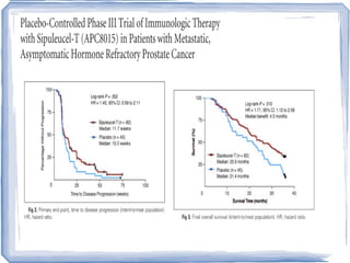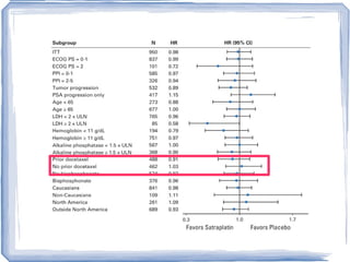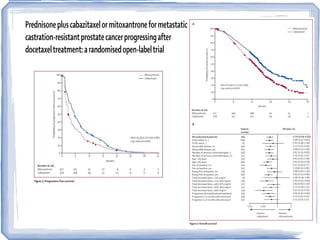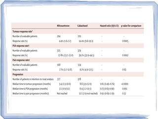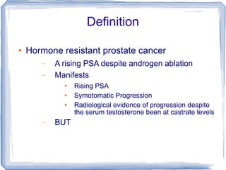 Chemotherapy can be used to treat hormone-resistant prostate cancer (HRPC) to help palliate symptoms and provide a survival benefit. Docetaxel plus prednisone was established as the standard first-line treatment based on results from the TAX 327 trial showing a median overall survival of around 18 months. Several prognostic factors can help predict survival outcomes on chemotherapy. For patients who progress after first-line docetaxel treatment, metronomic cyclophosphamide with prednisone shows promise as a well-tolerated second-line option based on early clinical trials. Ongoing research continues to evaluate new agents for first- and second-line HRPC.