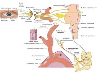 Horner syndrome results from disruption of the sympathetic nerve supply to the eye. It is characterized by three key signs: ptosis, miosis, and anhidrosis. The syndrome can be classified based on where along the sympathetic pathway the disruption occurs. Testing involves confirming the diagnosis with apraclonidine, which causes reversal of miosis and ptosis in denervated eyes. Investigations depend on classification and may include imaging of the brain, cervical spine, chest, or neck vessels to identify underlying causes.