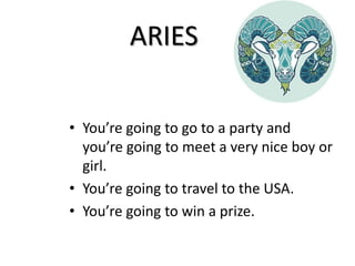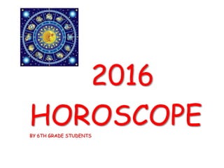 This document contains horoscopes for the year 2016 written by 6th grade students. Each horoscope consists of 3 predictions and is grouped by zodiac sign. The predictions cover events like meeting people, travel, career success, adventures, birthdays, pets, hobbies and more. The horoscopes maintain an optimistic and playful tone in forecasting positive experiences and opportunities for the coming year.