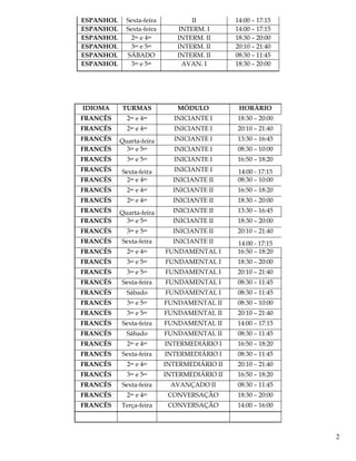 The document lists the language courses, class schedules, and modules offered at a language school. It provides the days of the week, times, and levels for English, Spanish, French, German, Italian, and other language courses. The schedule includes classes at various times during the day and weekend for beginner, intermediate, advanced, conversation and other modules.