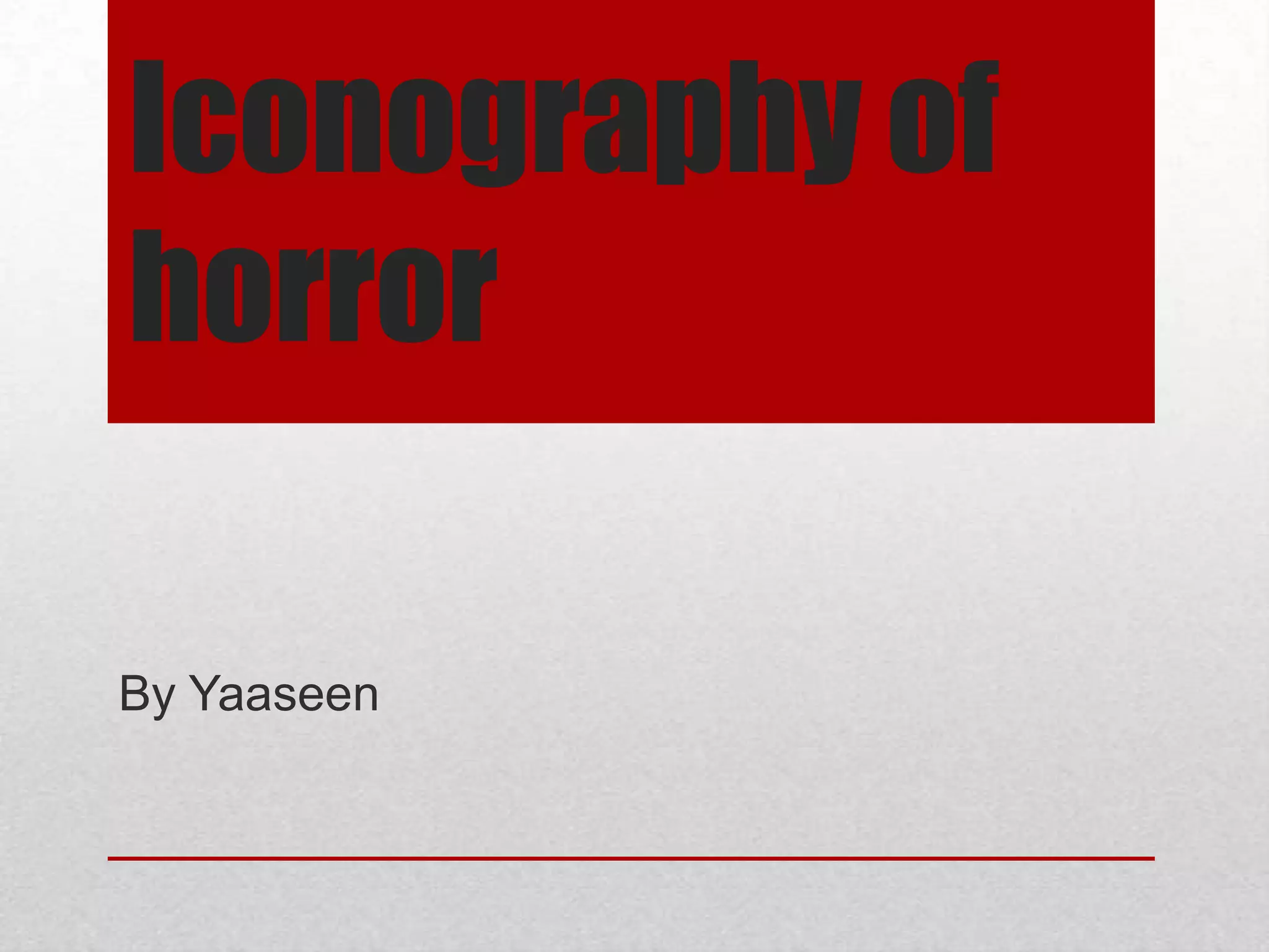 The document discusses common iconography in horror films, including the use of weapons like knives and chainsaws by killers, the depiction of blood to show violence, the tendency to feature female victims who are often scantily clad teenagers, and the inclusion of devils and demons to make the films seem more realistic and frighten audiences who believe in such supernatural entities.