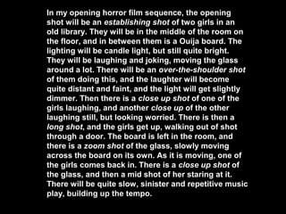 The document outlines the opening sequence of a horror film. It will begin with two girls laughing while using a Ouija board in an old, candlelit library. As the lights dim and the board begins moving on its own, one girl returns to find it in the dark. When she lights a match, her candle briefly illuminates a sinister masked face before she screams. The sequence aims to build tension through dim lighting, eerie music and the girls' heavy breathing without dialogue. It will establish the haunted and psychologically terrifying themes of possession and masks that set this horror film apart from those focused on gore.