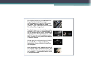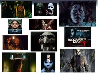 The document discusses conventions and themes in the horror genre. It outlines that in the 1980s, slashers like Friday the 13th and A Nightmare on Elm Street were popular, while later films mixed comedy. Throughout the decade, Stephen King adaptations were common. In the 2000s, remakes of American and foreign films emerged. Key themes discussed include good vs evil, religion, science gone bad, and the classic gothic. Elements like isolated settings, characters archetypes, camera techniques, sound, lighting, and editing are described as common horror conventions. Narrative and audience theories are also referenced to analyze horror storytelling.