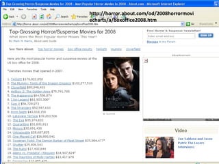 The top-grossing horror films of 2008 were Saw V, which earned $41.5 million in its opening weekend, followed by Quarantine, which earned $14.1 million in its opening weekend. The third highest-grossing horror film of 2008 was The Strangers, which earned $10.5 million in its opening weekend.