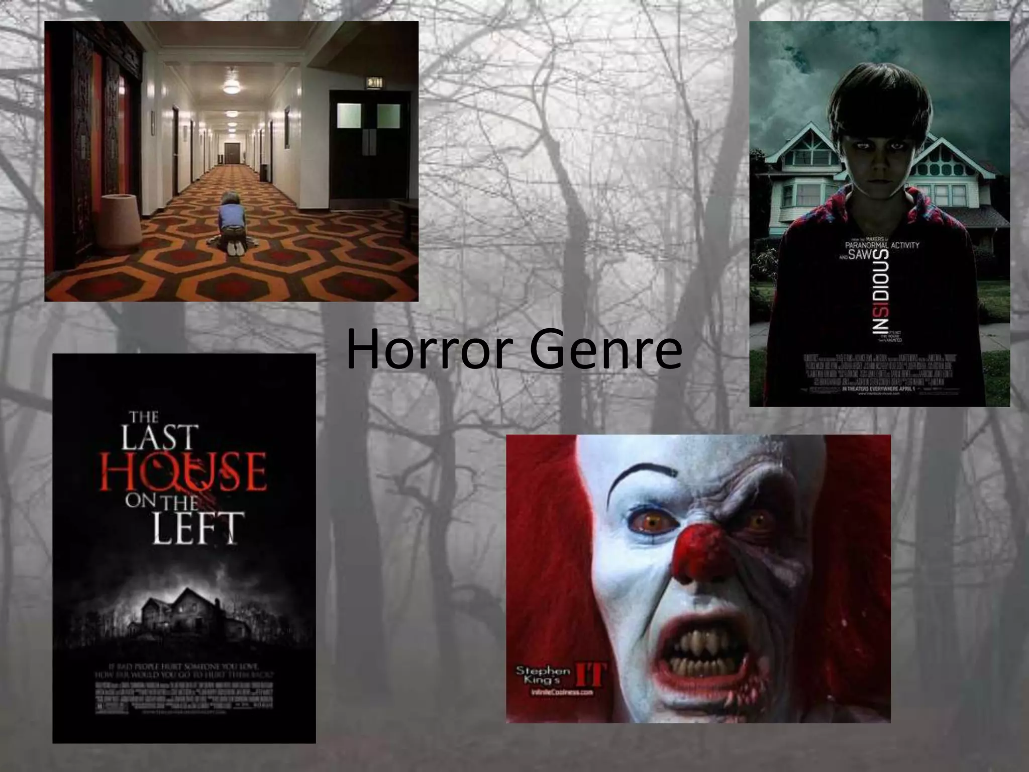The document provides an overview of the horror genre, including what defines horror films, their history and conventions. It distinguishes horror from thriller films, noting horror plays on primal fears through supernatural or disturbing scenes. Key conventions of horror discussed include isolated settings, technical techniques like lighting and camera work, common character archetypes, and themes of good vs evil. The document also examines two horror film posters and their use of visual elements and text to convey horror themes and intrigue audiences.