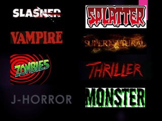 Horror films aim to frighten audiences through depicting death, villains and the unknown. Common sub-genres include slashers, where a killer stalks victims one by one; and zombies, where the undead feast on human flesh. Effective techniques include jump scares, ominous music and lighting, graphic violence, and following victims as threats loom. Locations often feature the woods or haunted houses to isolate characters. Overall, horror films utilize fear-inducing tropes and conventional story structures to entertain through fear.