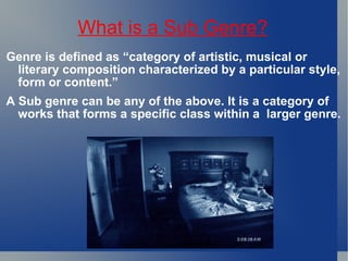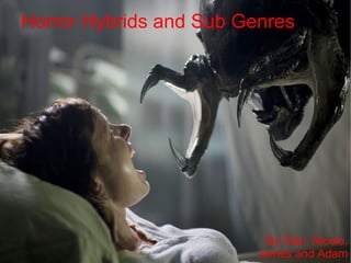 The document discusses horror subgenres and hybrid genres. It defines a subgenre as a category of works within a larger genre characterized by a particular style or content. Some common horror subgenres mentioned are comedy horror, slasher films, supernatural horror, and psychological horror. The document also defines a hybrid genre as a mix of two different genres, such as the combination of western and horror in "Deadlands", or the sci-fi/horror blend of "Alien". Horror comedy combines horrific elements with comedy. Slasher films involve a psychopathic killer stalking victims with a weapon. Supernatural horror depicts impossible events like demons. Psychological horror builds tension through character fears and emotions.