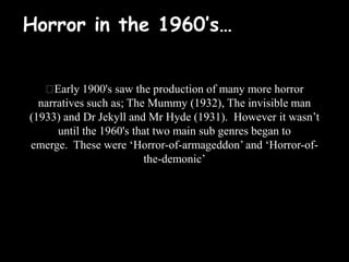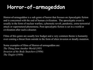 In the 1960s, two main horror subgenres emerged: horror-of-armageddon and horror-of-the-demonic. Horror-of-armageddon focuses on apocalyptic events like nuclear war, pandemics, or alien invasions. Horror-of-the-demonic suggests an evil spiritual presence undermines existence, often taking the form of demons or witches. Examples of each subgenre from the late 1950s-1960s are provided. George Romero's 1968 film Night of the Living Dead influenced the genre by blending psychological horror and gore to make the threat of zombies feel realistic and applicable to everyday life.