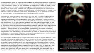 The document summarizes techniques used in an effective horror movie poster that the author intends to replicate for their own poster. Some of the techniques discussed include: placing the title at the bottom so it is in shadow of the main image; including previous films by the director to appeal to fans; using a single large unnerving main image to set the tone; limiting additional text to avoid revealing too much of the plot; and using a color palette of black and white with subtle red to emphasize mystery and danger. The author analyzes how these techniques appeal to horror movie audiences and effectively advertise the intended tone and content of the film without revealing too much.