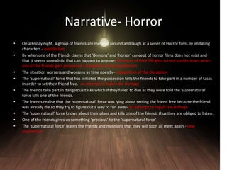 A group of friends mocks horror films until one friend is possessed by a supernatural force. The force commands the friends to complete dangerous tasks or it will kill them. As the situation escalates, the friends realize the force lied about freeing their friend, who has already died. They try to escape, but the force kills another friend, forcing the remaining ones to obey. The force finally departs after receiving something precious, saying it will meet them again, disrupting the friends' lives indefinitely.