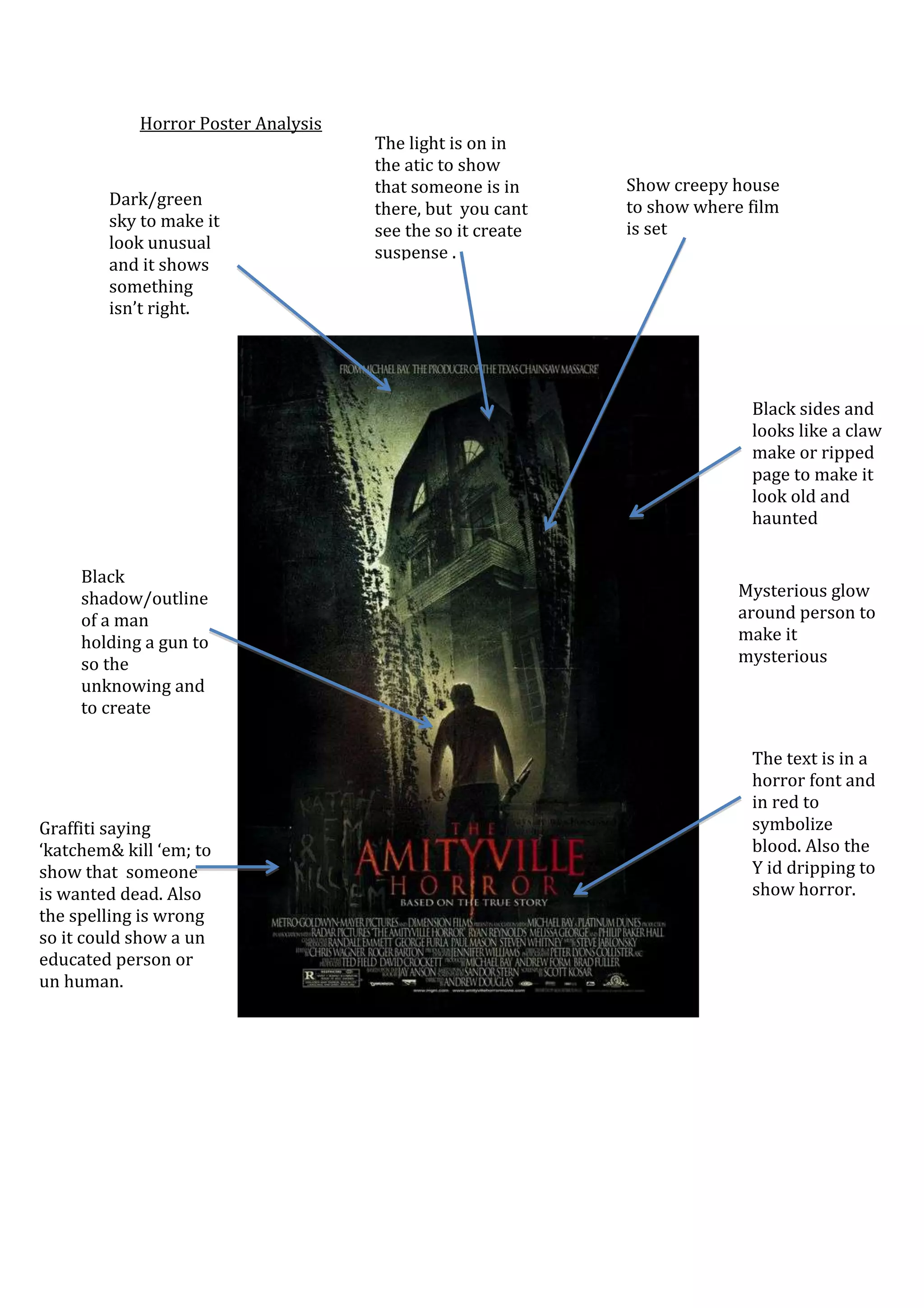 The document analyzes elements of a horror movie poster that create suspense and an unsettling tone. These include a dark green sky to imply something is wrong, light coming from an attic window where an unseen figure lurks, and a creepy house setting. Additional visuals meant to evoke horror are a torn and aged look to the poster, a shadowy figure holding a gun, graffiti implying someone wants to kill, and a mysterious glowing figure. Text is designed to look bloody with a horror font and dripping letters.