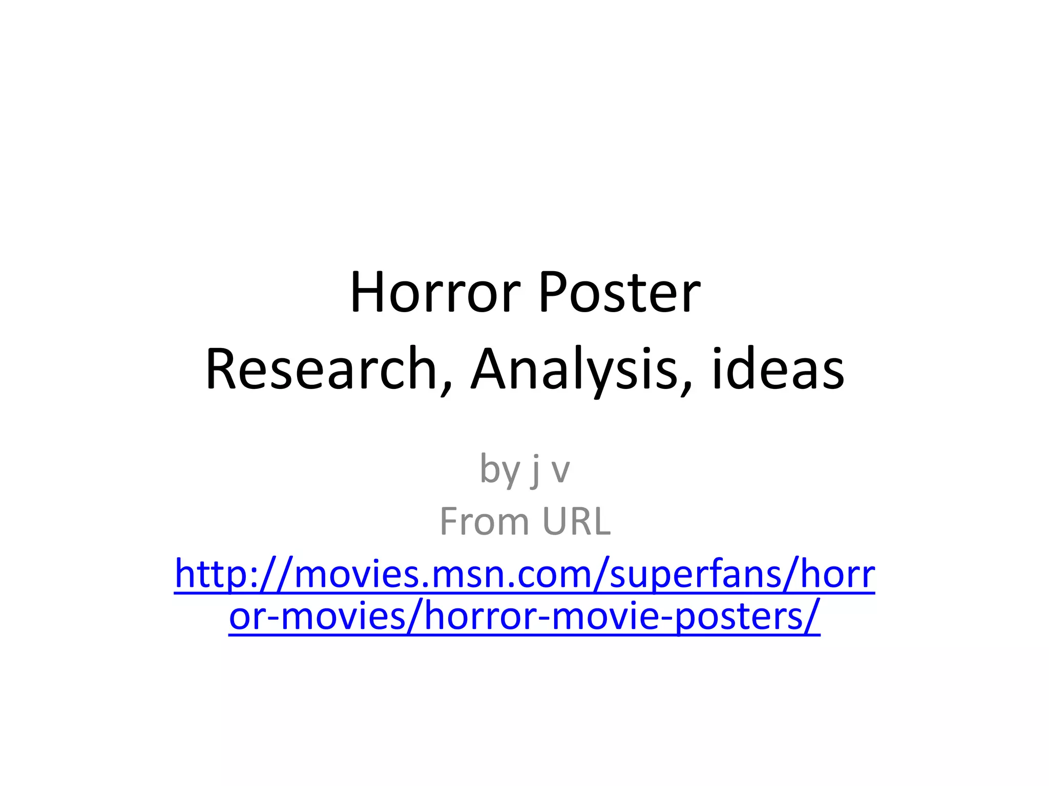 Horror movie posters have evolved over time to effectively promote upcoming films. Early posters relied on vivid imagery to imply frightening themes and catch the attention of audiences. Modern designs tend to use more subtle psychological techniques, ambiguous imagery, and creative fonts to intrigue viewers without revealing too much about the plot.