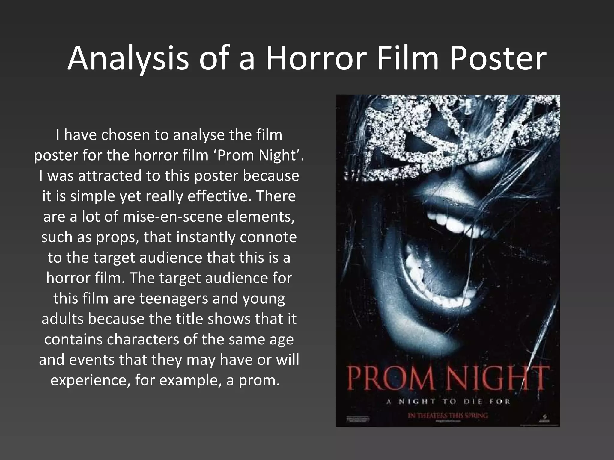 The analysis examines the horror film poster for 'Prom Night,' focusing on its minimalistic yet impactful design that effectively communicates the horror genre to its teenage audience. Key elements include a dark color palette, the juxtaposition of glamorous props like the tiara against themes of violence, and an evocative tagline that hints at the film's plot. The poster's worn appearance and highlights of fear are used to draw interest and curiosity, positioning it as a teaser for potential viewers.