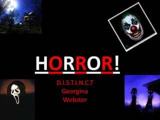 Horror films aim to make audiences feel uneasy through the use of isolated or abandoned settings like haunted houses or graveyards. Technical elements like unsteady camera angles, jump cuts, and discordant music are employed to build tension. Iconic colors of red and black, with low lighting, costumes, and props involving weapons also contribute to the horror aesthetic. Narratives typically involve a protagonist confronting an antagonist, sometimes with an ambiguous ending, and common character types are the final girl, victims, and villains like ghosts or serial killers. Recurring themes explore binaries of good versus evil and known versus unknown.