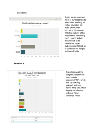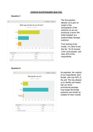 The document analyzes the results of a horror film questionnaire targeted at teenagers. It found that most respondents were female, aged 16-18, and studying at A-level or university. Respondents enjoyed watching horror films and found suspense and excitement most appealing in supernatural films like The Conjuring and Insidious. Most watched horror films every now and then or sometimes and were most influenced by film trailers. The analysis allows the filmmakers to profile their target audience and design a promotional campaign accordingly.