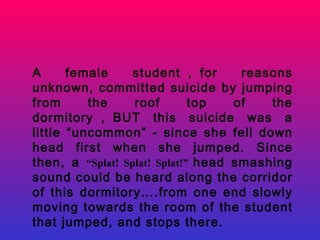 A female student committed suicide by jumping from the roof of her dormitory. Afterwards, students heard splatting sounds moving down the hall towards the room of the deceased student. When a janitor went to clean the room, she heard the splatting sounds move towards the room and a voice saying it could see her even though she was hiding under a desk. When she looked under the door, she saw two bloody eyes staring back at her.