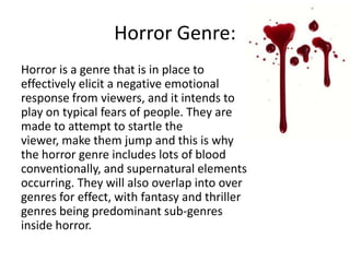 This document outlines several common sub-genres of horror films. These include body horror, which focuses on graphic destruction or mutation of the human body; gothic horror, which blends horror and romance themes for a darkly mysterious tone; demonic horror, depicting the conflict between good and evil through demonic forces; and Japanese horror, emphasizing psychological tension and suspense through the use of ghosts. Other sub-genres discussed are Lovecraftian, monster, slasher, psychological, space goth, and supernatural horror. Each has distinguishing themes and conventions related to the type of fear or horror they aim to elicit from viewers.