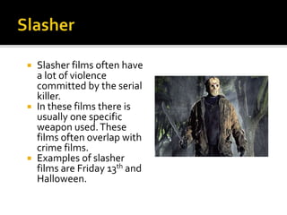 Slasher films often depict graphic violence committed by a serial killer using a single weapon, and may contain elements of crime films. Examples given are Friday the 13th and Halloween. Supernatural horror involves paranormal elements like demons, ghosts, and takes place frequently in houses. Comedy horror aims to scare audiences but also make them laugh at their fears using dark humor. The document then lists various horror subgenres and provides an analysis comparing the comedy horror films Gremlins and Tucker and Dale vs Evil, noting their different approaches to the genre.