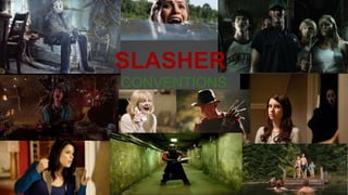 This document outlines conventions of various horror sub-genres including slasher, possession, psychological, and gothic. It discusses common elements like the male antagonist in slasher films typically wearing dark clothing and wielding memorable weapons. Possession films often involve levitation and use of religious objects during exorcisms. Psychological horrors frequently employ plot twists and flashbacks. Gothic settings typically feature run-down mansions and castles with Victorian interiors lit by candles.