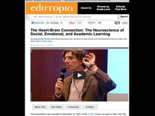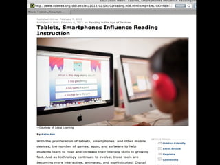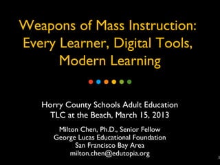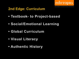 This document discusses innovations in K-12 education. It outlines 6 leading edges of innovation: 1) thinking, 2) curriculum and assessment, 3) technology, 4) time and place of learning, 5) co-teaching including parents, and 6) empowering today's youth. It advocates for a learning society that prioritizes education, and argues schools should prepare students for real life by blending formal and informal learning both inside and outside of the classroom. Technology like 1-to-1 devices, digital content, and online learning are positioned as "weapons of mass instruction" that can transform education.