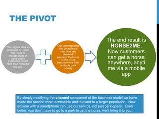 The team originally proposed renting horses at parks but modified it to an on-demand horse rental service called HORSE2ME using a mobile app. This makes the service more accessible than only being available at parks. The app allows users to request a horse anywhere and anytime which are brought to their location. The document describes the service, pricing plans, how to use the app, comparisons to other transportation services, and pitches the environmental and animal welfare benefits.