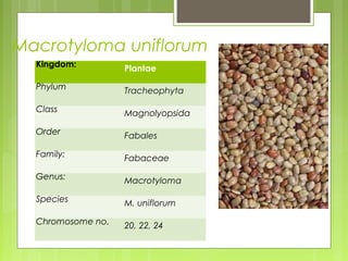 Horse gram is a species of flowering plant in the legume family. It is a climbing herb with trifoliate leaves and papilionaceous flowers that produce linear pods containing 5-10 seeds. The plant has several varieties that are distinguished by differences in their fruit pods. Horse gram is drought-resistant and tolerant of poor soils, requiring warm temperatures between 20-30°C. It has a number of traditional medicinal uses for treating cough, flatulence, fever, and more, but can also cause harm if consumed by certain groups like pregnant women.
