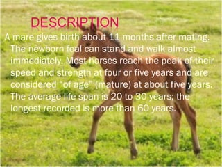 Horses typically give birth after an 11 month gestation period. Newborn foals can stand and walk shortly after birth. Horses reach their peak strength and speed at around 4-5 years old and are considered mature at 5 years old. Horses live an average of 20-30 years, with the longest recorded lifespan being over 60 years. Horses originate from the steppe regions of Eastern Europe and Northern Asia but are now domesticated worldwide.