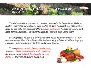 L’hort d’aquest cursno es cap novetat, més aviat és la continuació de les moltes i discretes experiències que moltes classes han anat fent al llarg dels anys en els patis interiors, aprofitant testos , jardineres , hortets construïts amb amb portes i plàstics... És la continuïtat de l’hort del curs 2008-2009. El curs passat va ser el d’arrencada d’un espai específic destinat a l’ hort escolar amb la idea d’aprofitar col·lectivament el que feien els diferents grups, i treure’n major rendiment científic, pedagògic i social. Es van plantar pèsols , faves , carabasses , patates , cebes , pastanagues , cols , enciams de dues menes, julivert , tomàquets , un ave- llaner i... Tal vegada alguna cosa més. Escola del Mar EL NOSTRE HORT 2009/10