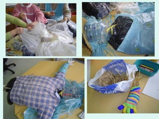 The children made a large puppet out of materials to place in their vegetable garden. The puppet is powered by wind and acts as a scarecrow to protect the garden. The puppet works well and the children think it is a nice addition to the garden.