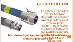 FD Johnson offers a wide range of Goodyear hydraulic hoses, highlighting their extensive product selection. The document encourages contacting FD Johnson for inquiries about fitting Goodyear hoses for various applications. Additional information and product offerings can be found on their website.