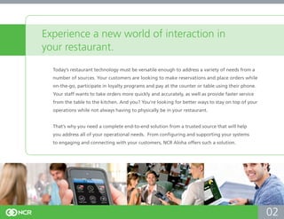 The document outlines NCR Aloha's comprehensive restaurant management solutions designed to enhance efficiency, customer engagement, and operational oversight. It emphasizes the importance of mobile technology for staff and guests, enabling quicker service, better order accuracy, and integrated loyalty programs. NCR Aloha aims to provide restaurants with greater control over their operations, including labor and inventory management, while ensuring data security and customer satisfaction.