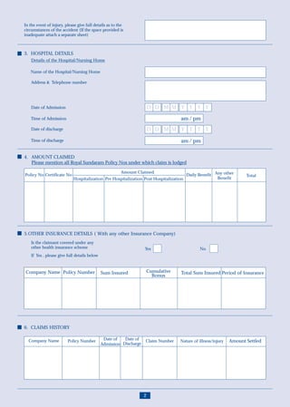 This document contains a health insurance claim form for Royal Sundaram Alliance Insurance Company. It requests information about the policyholder, patient, illness details, hospitalization details, other insurance policies, previous claims history, and authorization to obtain medical records. The attending physician section collects medical information about the patient's condition, treatment, and certification of the details provided.
