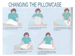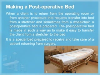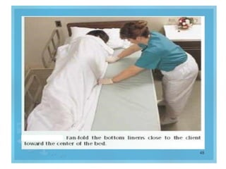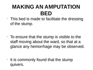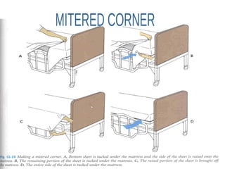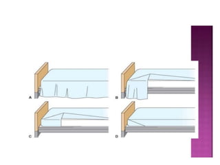 The document outlines the procedures and importance of bed making in a healthcare setting, emphasizing the comfort and hygiene necessary for patients. It details various types of beds and their specific making techniques, along with precautions to maintain a clean and safe environment. Additionally, it provides guidance on essential bed accessories and the correct handling of linens to prevent contamination.