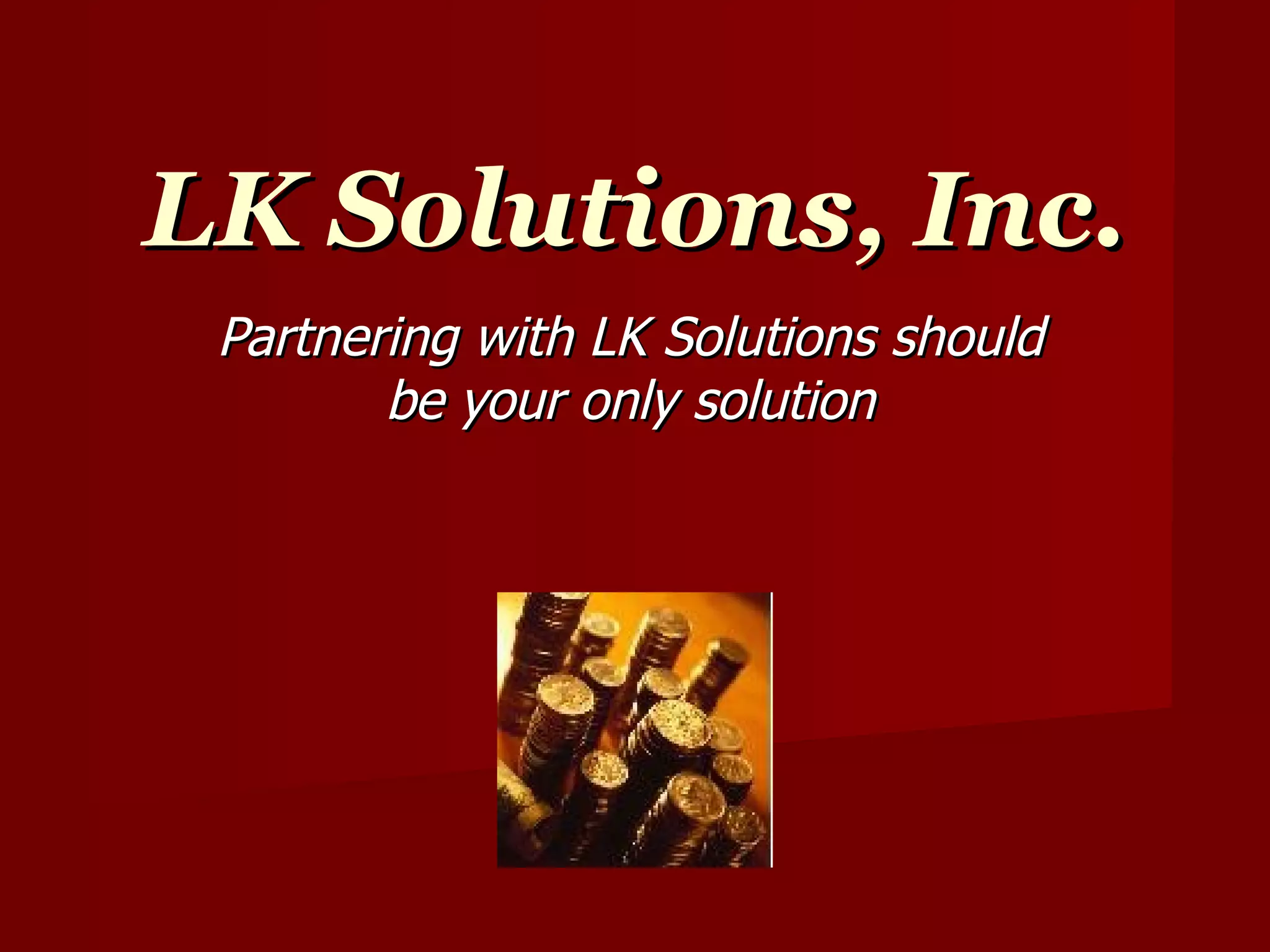 LK Solutions, Inc. provides integrity, accuracy, and honesty in financial performance and recovery services. With over 17 years of experience, LK Solutions aims to outperform financial expectations through proven methods. Services include contingency-based underpayment recoveries, contract reviews, revenue code enhancements, and executive summaries to maximize reimbursement. LK Solutions has achieved over $30 million in recoveries for various health systems across the country through specialized services in areas like cardiac care, orthopedics, and pharmacy.