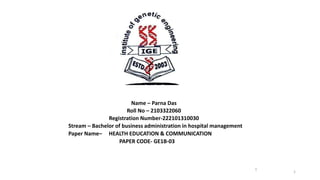 Parna Das' paper discusses hospital information systems. It begins with an introduction explaining that hospital information systems are used to manage patient data and hospital operations. It then covers objectives like centralized patient management; functions like online appointments and payments; hardware and software requirements; and classifications by functional area and management level. The paper references sources on hospital information systems and acknowledges help from teachers.