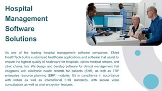 Emed Healthtech specializes in creating customized hospital management software that integrates with electronic health records and enterprise resource planning modules, complying with both Indian and international standards. Their solutions streamline patient management, reduce manual paperwork, and improve clinical outcomes through automated workflows. The company offers both basic and advanced modules tailored to specific hospital needs, supported by over 7 years of experience in healthcare IT.