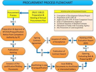 The document provides information about the procurement process for medical supplies and equipment at hospitals. It discusses the different types of supplies that must be procured, including medical equipment, disposable supplies, laboratory chemicals and diagnostics, vaccines, and medical gases. It also outlines the national hospital formulary that determines which medicines are procured according to the essential medicines list from the WHO. The document discusses the various methods used for procurement, including open competitive bidding, request for quotations, direct contracting and petty purchases, in accordance with the relevant rules and regulations.