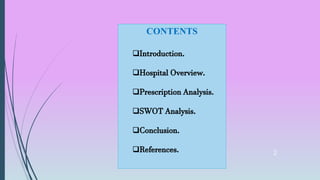 - A SWOT analysis found strengths like affordable care and experienced physicians, but also weaknesses like an unhygienic environment and lack of technology. Opportunities for improvement include better infrastructure and digital records.
