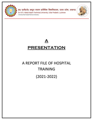 The document is a report on hospital training conducted by Akarshit Prajapati at Dr. Om Prakash School of Pharmacy. It includes a certificate, declaration, acknowledgements and lists of contents. The report summarizes the objectives of hospital training and provides details about the different departments in the hospital including OPD, emergency ward, general ward, surgical ward, pathology, injection room and patient observation charts. It describes the aims, skills and procedures for treating common medical emergencies as part of first aid training in the emergency ward.