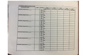 This document provides samples of common forms used in hospitals, including a Kardex which gives an overview of each patient updated every shift. It also includes standing order sheets which authorize nurses and medical assistants to complete tasks without a physician's order, as well as ER forms, vital signs sheets, pre-operative checklists, I&O sheets, consent forms, CBG monitoring sheets, and nurses' notes.