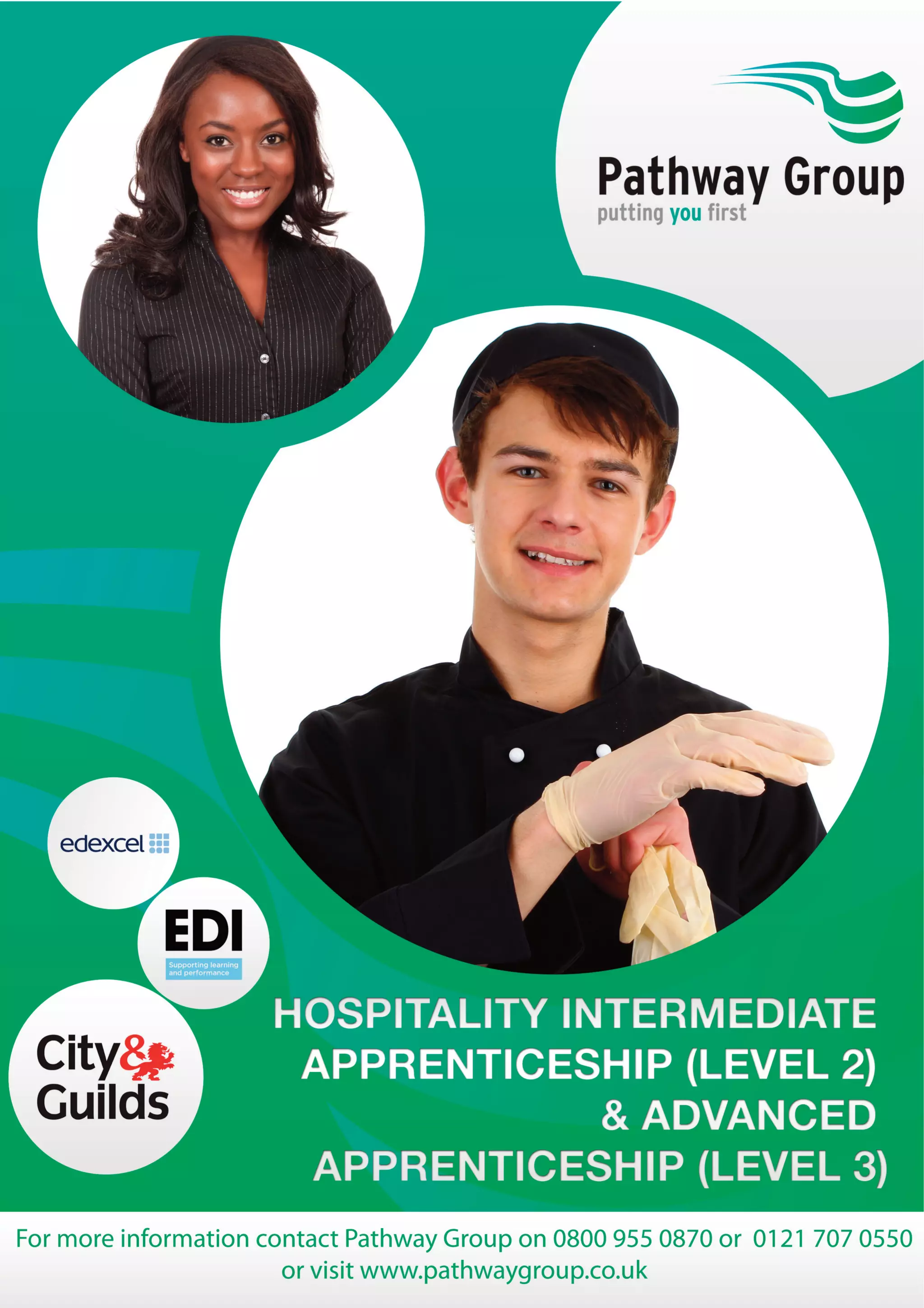 The document provides details about hospitality apprenticeships, specifically level 2 intermediate and level 3 advanced programs. For further inquiries, it encourages contacting Pathway Group via phone or visiting their website. The contact information is repeated for emphasis.