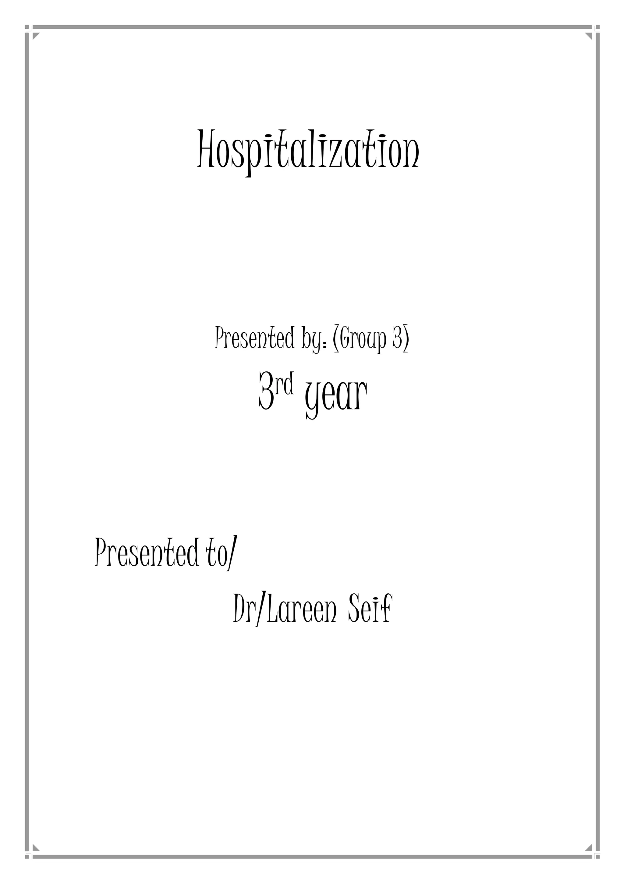 This document provides an overview of hospitalization from several perspectives. It defines hospitalization and describes the phases a child may go through during hospitalization. It identifies common stressors for children of different ages related to hospitalization. It also outlines the typical reactions of children and families to hospitalization and guidelines for preparing children, units, and families for the hospitalization process. Finally, it discusses the nursing role in addressing the stressors of hospitalization and preparing for discharge and home care.