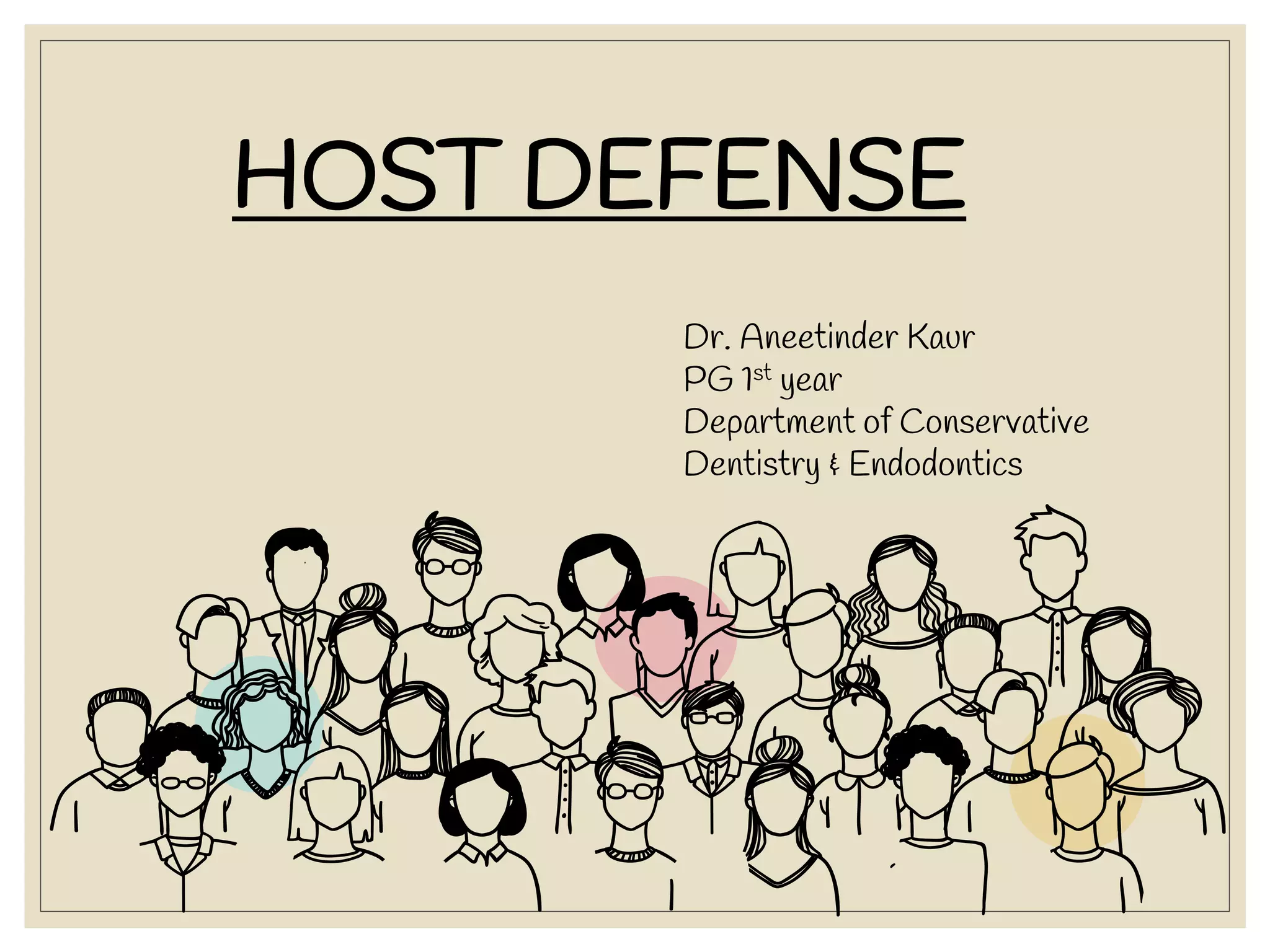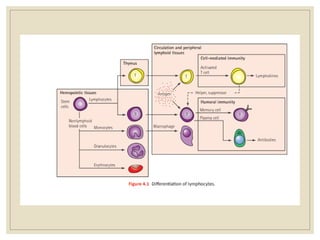 The document discusses host defense mechanisms against pathogens. It describes three lines of defense: 1) physical barriers like skin and mucous membranes, 2) inflammatory response and defensive cells, and 3) the immune system. The immune system has both innate and acquired branches. Innate immunity provides non-specific protection using physical and chemical barriers while acquired immunity involves adaptive, antigen-specific responses. Key cells of the immune system that provide defense include macrophages, neutrophils, lymphocytes and natural killer cells. Antibodies and the complement system are important components that help eliminate pathogens.