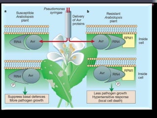 The document discusses the complex interactions between plants and pathogens, detailing types of pathogens, their effects, and plant immune responses. It outlines models of recognition and defense mechanisms, including the gene-for-gene hypothesis and various interaction models such as the elicitor-receptor and guard hypotheses. The conclusion emphasizes the specificity and dynamism of plant-pathogen interactions, with defense signaling initiated by pathogen recognition.