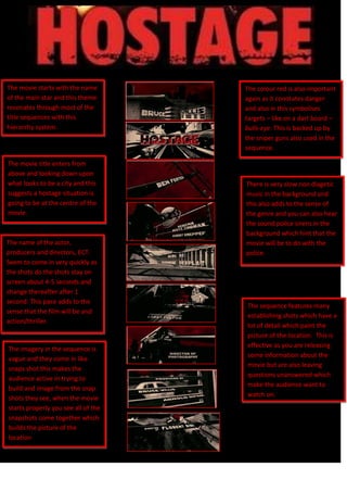 The sequence establishes the location with detailed establishing shots, leaving some questions unanswered to intrigue viewers. Slow non-diegetic music and police sirens in the background set the tone of the police genre. The color red symbolizes danger and targets, reinforced by images of sniper guns. Brief snapshots build an image that comes together at the start, setting the pace for an action/thriller film. The title enters from above a city, suggesting a hostage situation will be central to the plot.