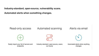 HostedScan offers 24/7 alerts and detection for security vulnerabilities through open-source scans such as OpenVAS, Nmap, SSLyze, and more. The service provides automated alerts for any changes and covers various areas including network, application, services, and encryption security. It is available for free with an option to upgrade, ensuring no proprietary scans are included.