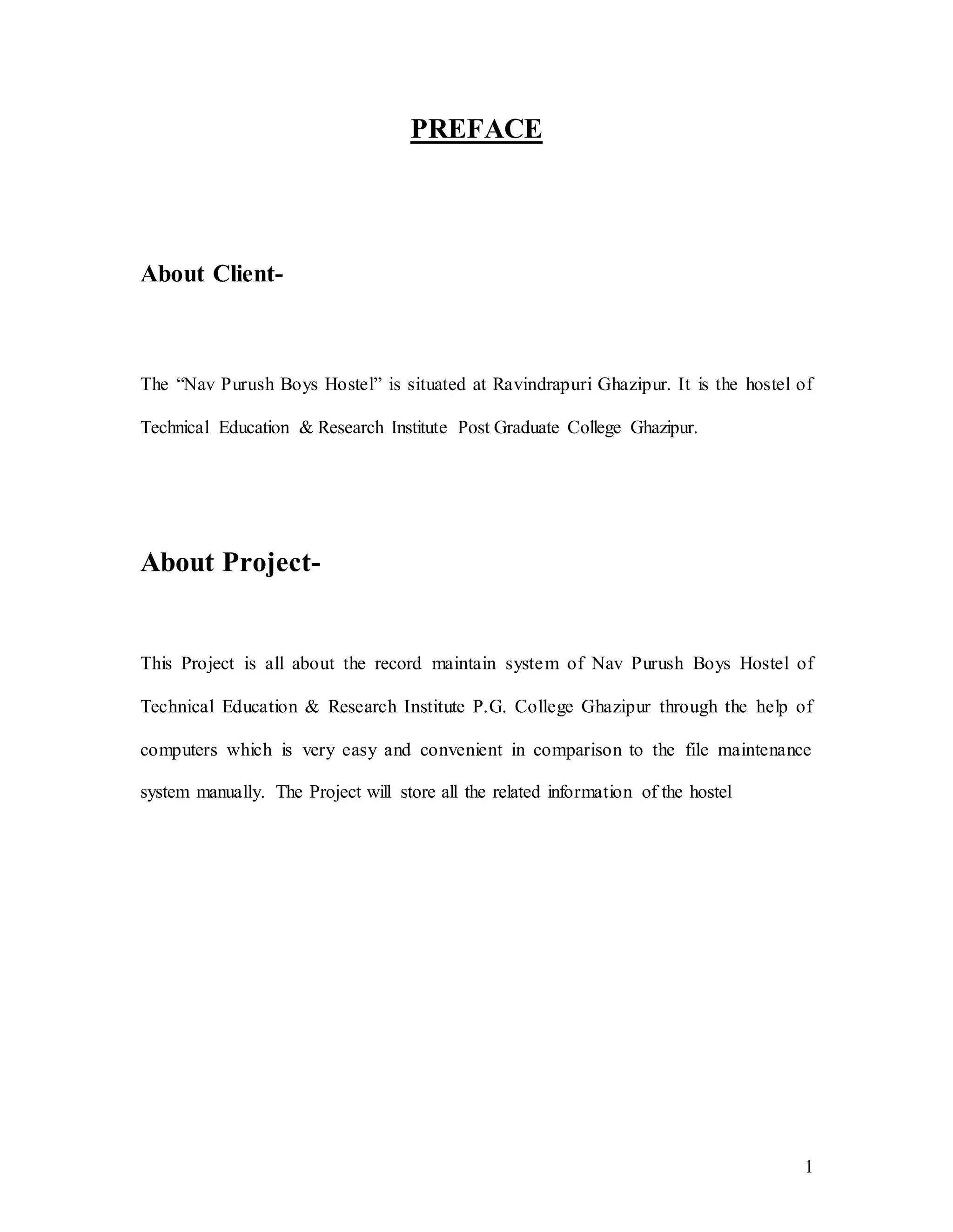 The document outlines the development of a computerized record maintenance system for the Nav Purush Boys Hostel at the Technical Education & Research Institute in Ghazipur, aimed at replacing the existing manual system. It details the project phases, objectives, software requirements, and the use of technologies such as Visual Basic and MS Access. Additionally, it emphasizes the significance of proper system design, implementation, and maintenance to ensure reliability and efficiency in managing hostel records.