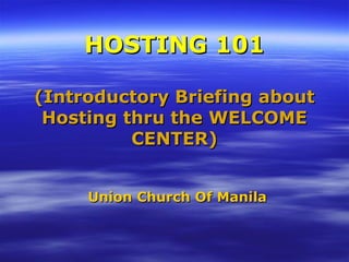 This document provides an introduction to hospitality ministry through the Welcome Center at Union Church of Manila. It discusses the importance of hospitality as a vital church ministry alongside preaching, teaching, and music. A good host is motivated by love for God and others, maintains a helpful and welcoming attitude, and behaves in a friendly, knowledgeable, and orderly manner. The document offers metaphors comparing hosts to salt, a city on a hill, and a lamp. It focuses hosts' concentration on guests, understanding their needs, and properly preparing oneself for the role. Tips are provided for engaging with newcomers in a sensitive way. Sample comments evaluate the hospitality of several Philippine churches.